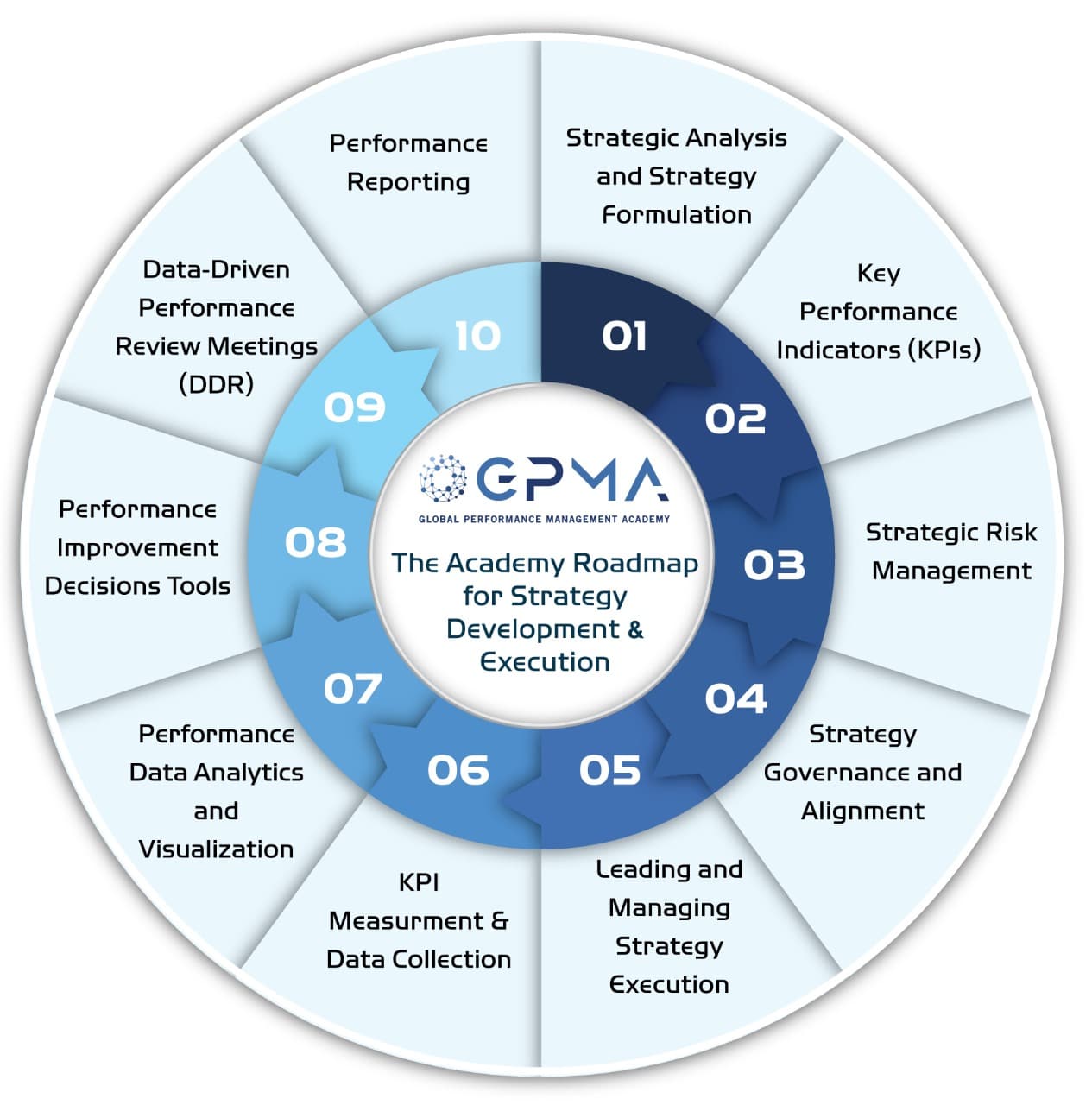 With over 20 years of consulting experience for government, for-profit, and nonprofit organizations across multiple countries, the Global Performance Management Academy (GPMA) has developed a model comprising ten key stages to help organizations articulate and achieve their vision through strategic planning and implementation. This model employs a precise, evidence-based methodology grounded in global best practices. It also serves as a framework for the competencies that managers, particularly those in strategy management or vision realization offices, must master. The Academy offers a dedicated training program for each of the ten stages.